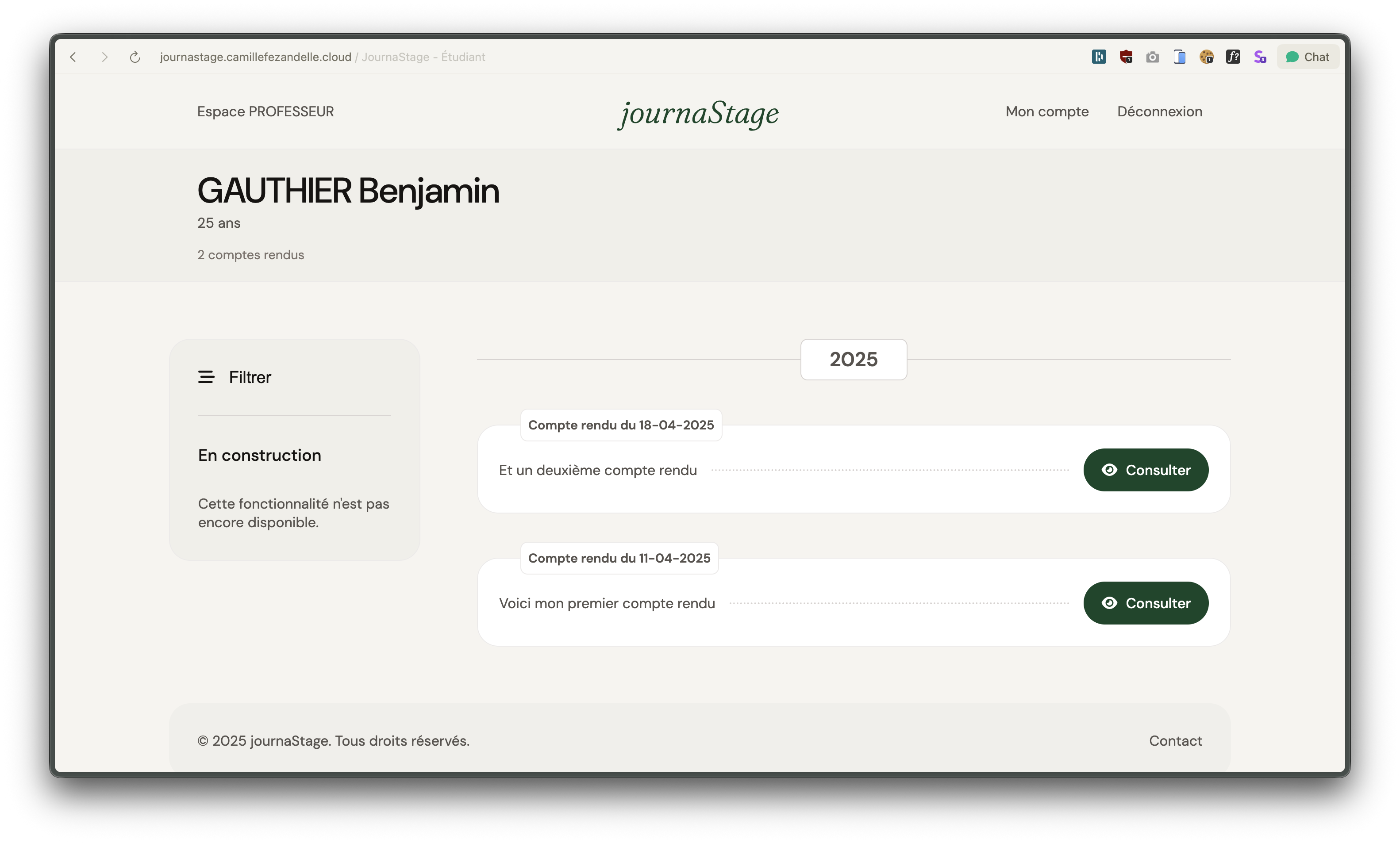 JournaStage est une plateforme web en PHP destinée à faciliter la rédaction et le suivi des comptes rendus entre étudiants et enseignants. Elle offre une interface simple, moderne et sécurisée pour centraliser tout le processus.